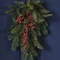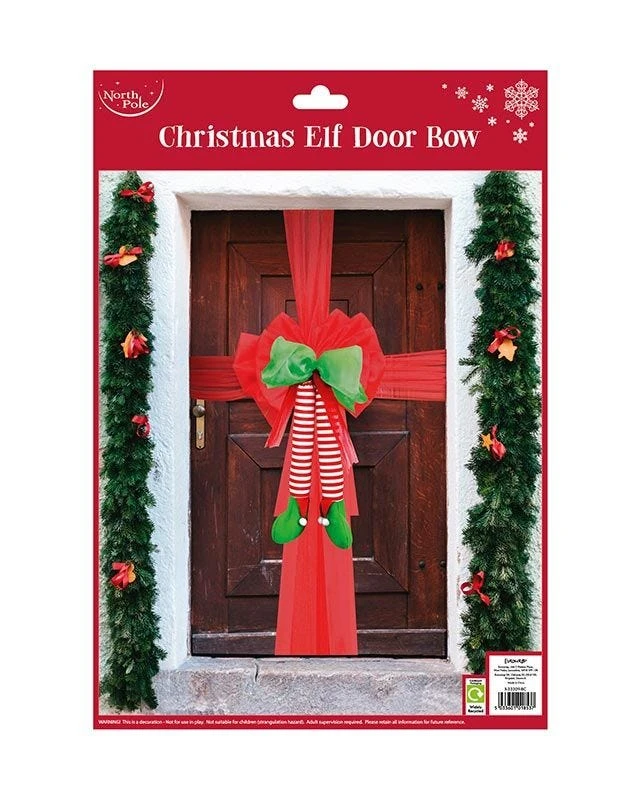 - This holiday door decoration for your home offers a fun twist on the traditional door arch! Add a fun, festive mood to your front door with this bow with elf legs and a bright red and green color scheme