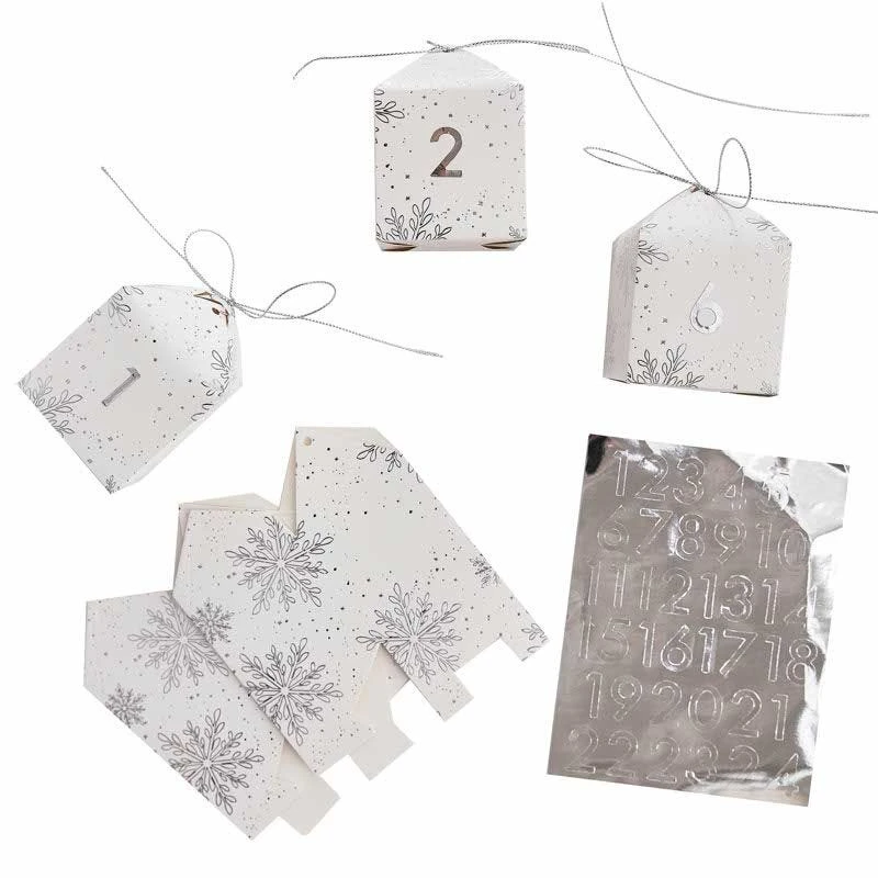 Countdown to Christmas with our silver foiled snowflake design advent boxes, simply pop up the boxes and fill with sweets and little treats for that special someone who just loves Christmas! Measuring 6cm wide by 9cm high, these little gift boxes are perfect as a stocking filler alternative. 24 boxes measuring 9cm (H) x 6cm (W) x 6cm (D)