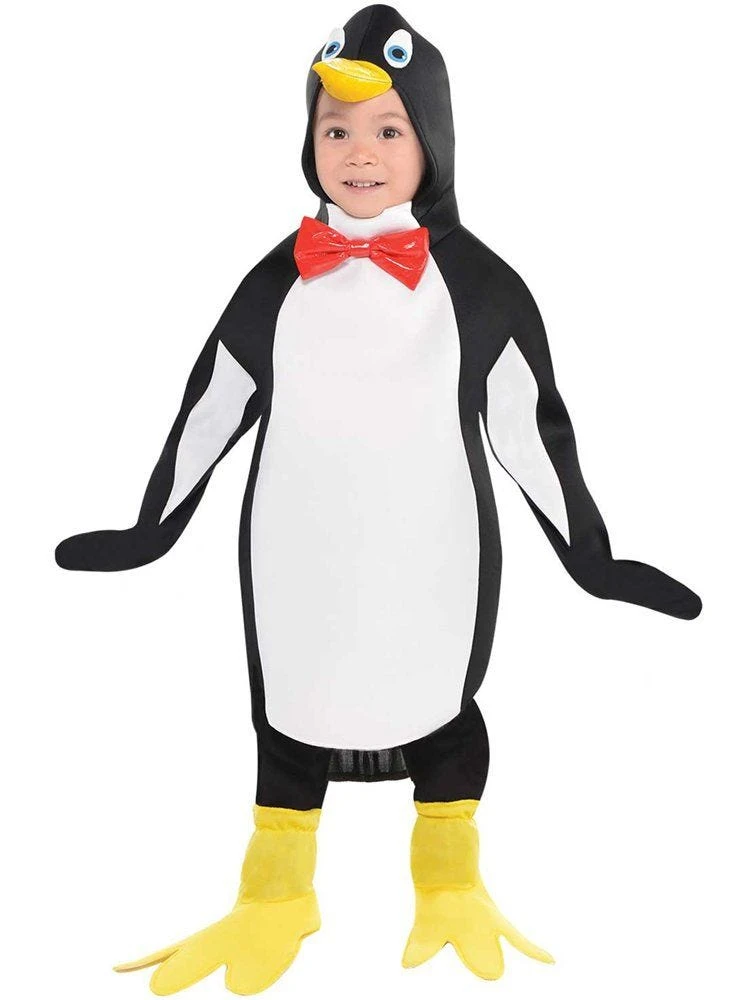 This Comical Penguin Costume includes a black and white bodysuit with an attached red bow tie and a matching black penguin headpiece with yellow beak.