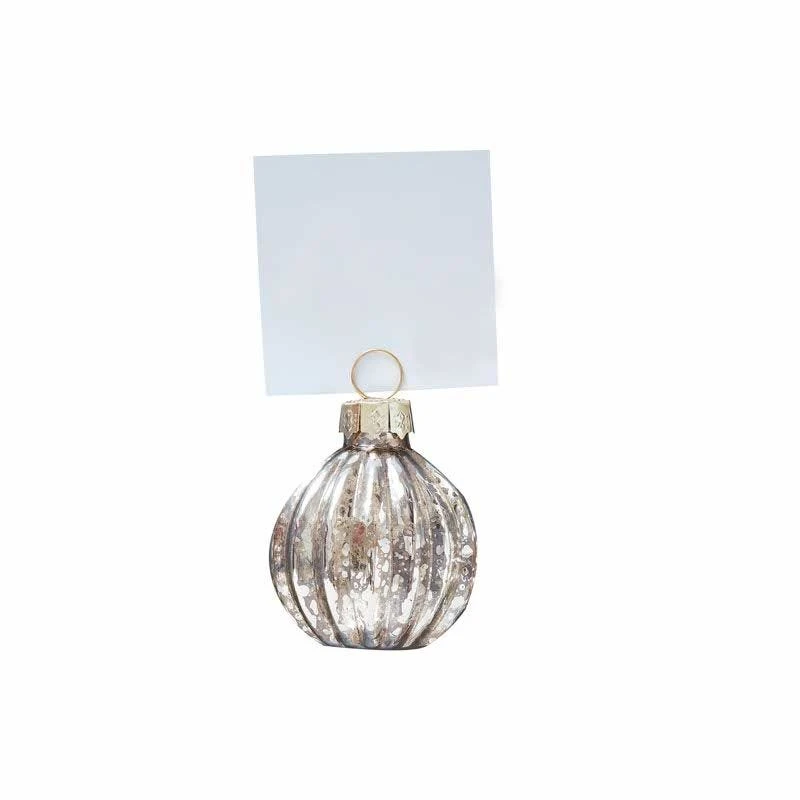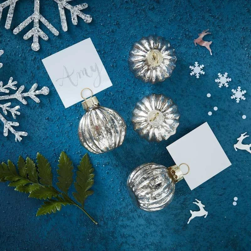 Dress your table with these stylish Silver Glass Bauble Christmas Place Card Holders. Each pack contains 6x Glass Bauble Christmas Place card Holders measuring 4 cm (D).