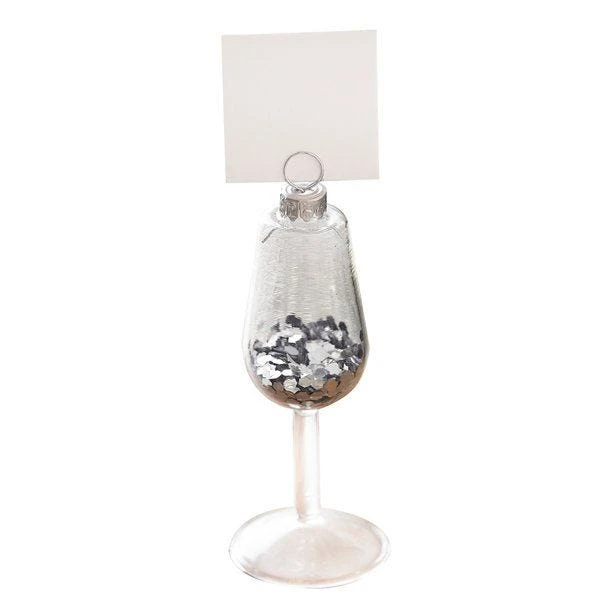 - Dress your table in style this season with these silver confetti filled place card holders. Each wine glass shaped place card holder comes with a silver top to slot in name cards. A great way to ensure your guests are seated in the perfect place around your table!