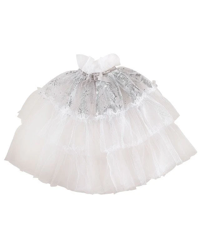 This cape is made from white tulle and features silver sequin detailing, finished with a silver velevet ribbon tie. 100% Polyester.