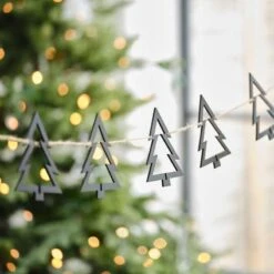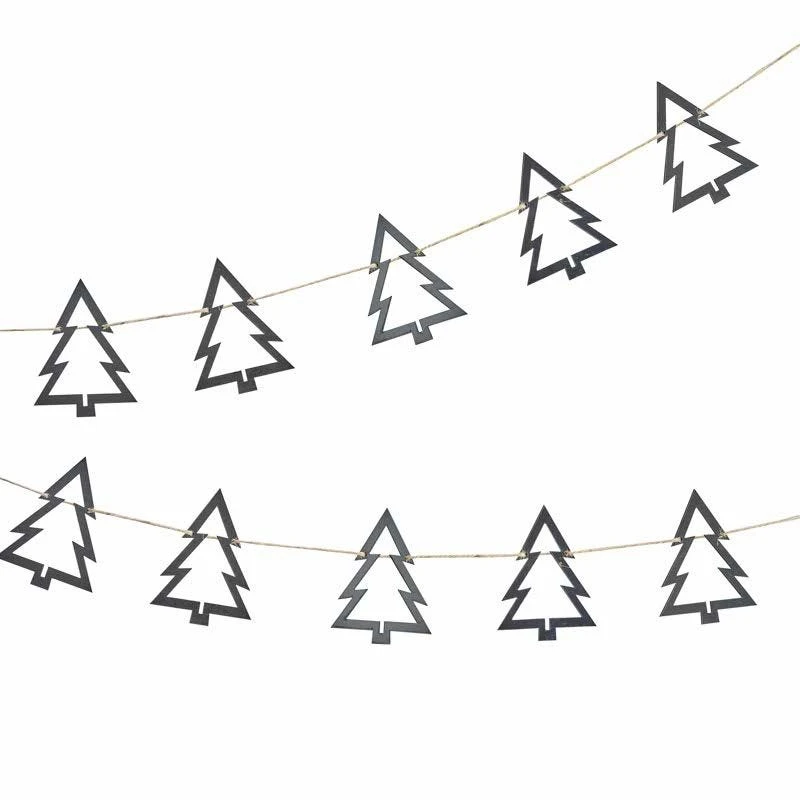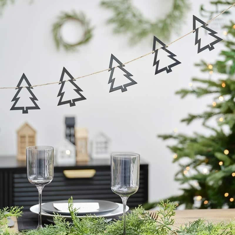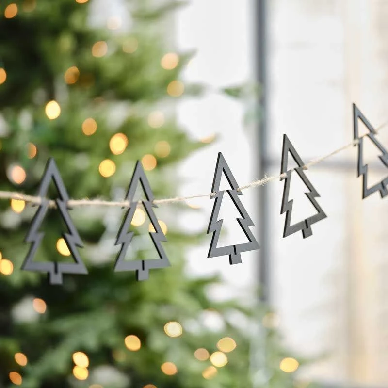 Bring a modern contemporary element to your holiday decor with this black wooden tree Christmas bunting. This Christmas garland contains 2m of bunting on hessian twine with 12 wooden trees.
